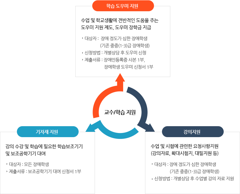 학습 도우미 지원 - 수업 및 학교생활에 전반적인 도움을 주는 도우미 지원 제도, 도우미 장학금 지급 - 대상자:장애 정도가 심한 장애학생(기존 중증(1-3)급 장애학생), 신청방법 : 개별상담 후 도우미 신청, 제출서류 : 장애인등록증 사본1부, 장애학생 도우미 신청서 1부