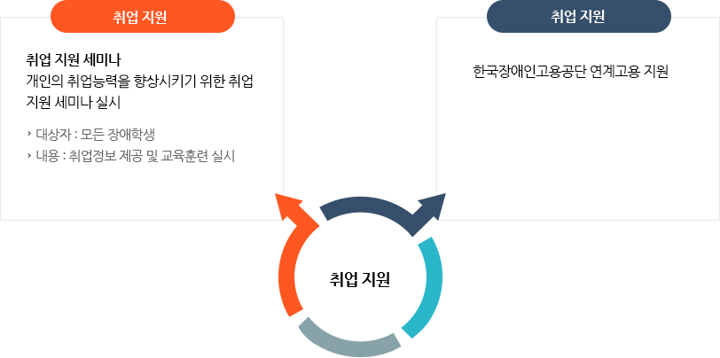 취업지원 취업지원 - 취업지원세미나 - 개인의 취업능력을 향상시키기 위한 취업 지원 세미나 - 대상자 : 모든 장애학생, 내용 : 취업정보 제공 및 교육훈련 실시 취업지원 - 한국장애인고용공단 연계고용 지원